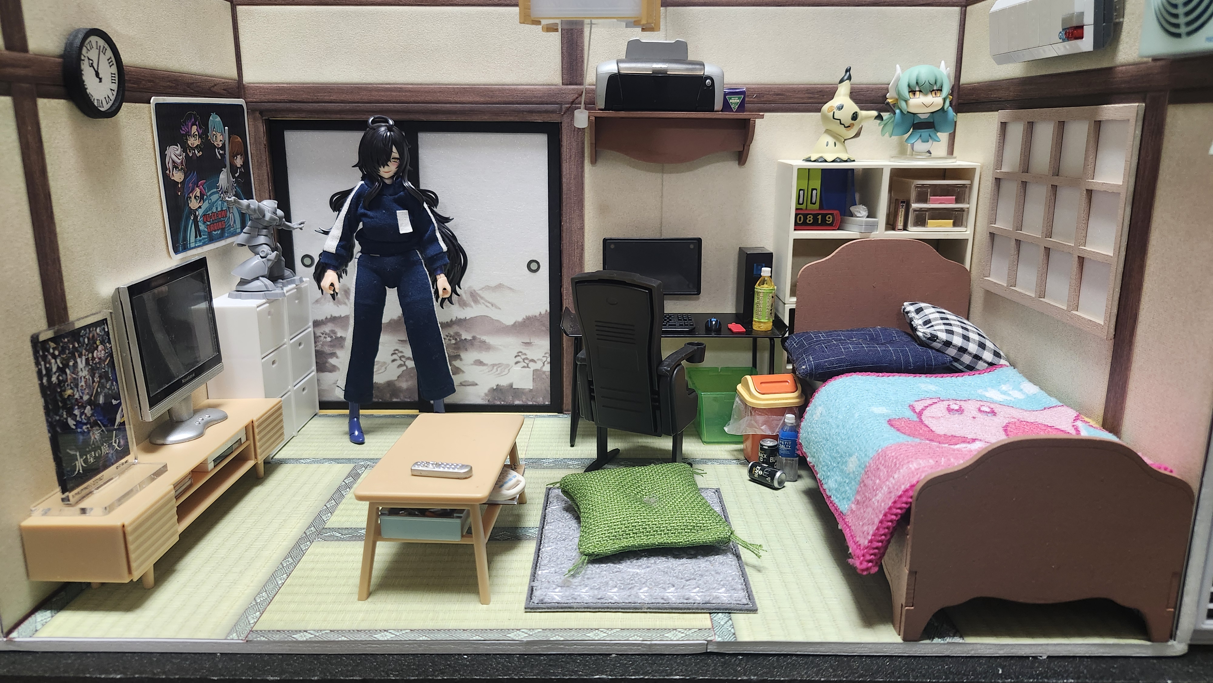 | … | 13025/08/25(月)00:41:52No.1346639624+>セリアのドールハウスパーツにちょっとガチャ電灯とか盛ればこんな感じに そうか!畳が4畳半2枚入ってるから半畳以外を組み合わせれば8畳の部屋が作れるのか! |