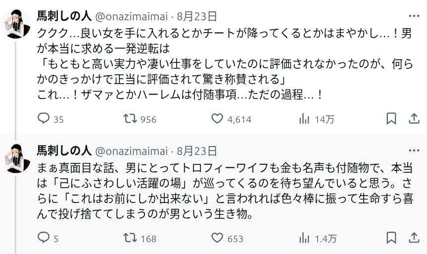 | … | 2425/08/25(月)05:28:17No.1346670851そうだねx1男はオレツエー志向…というよりも |