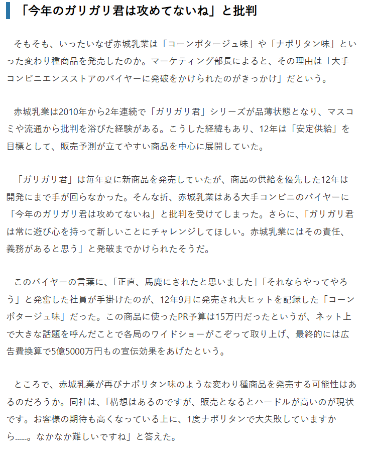 | … | 1925/08/25(月)20:41:41No.1346857208+ガリガリ君のゲテモノもあれをヒントに年寄り向けの食品に技術転用されてるからね |