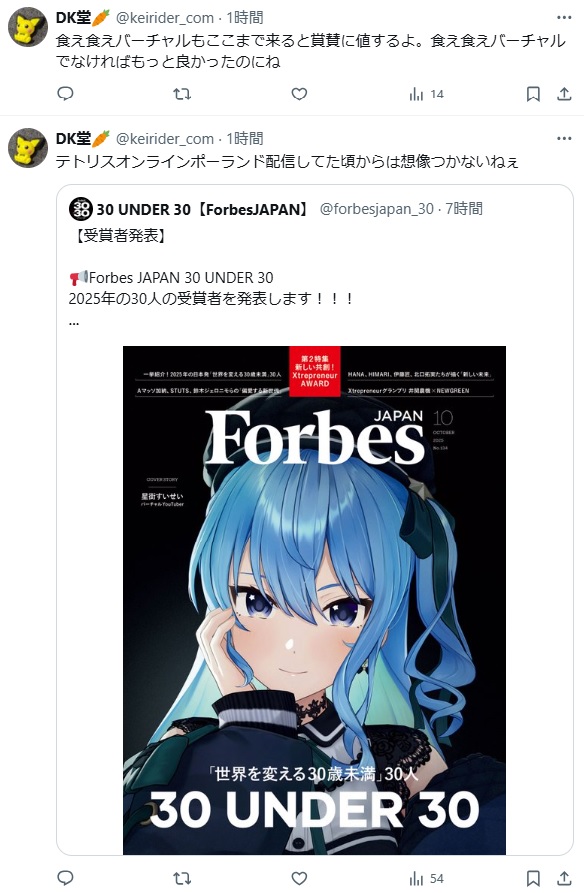| … | 2125/08/25(月)21:42:37No.1346886975そうだねx5世界を変える30歳未満30人にはりっくんも選出されてるんだから怒らないでよ |