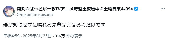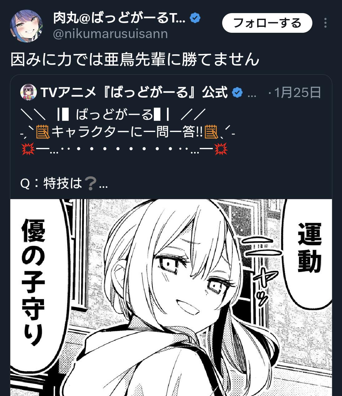 | … | 4025/08/26(火)01:39:51No.1346973949+>肝心の優ちゃんのばっどがーるのフリがハッキリ言って特に先輩の気を引くことに関して最善手ではないのが吹く |