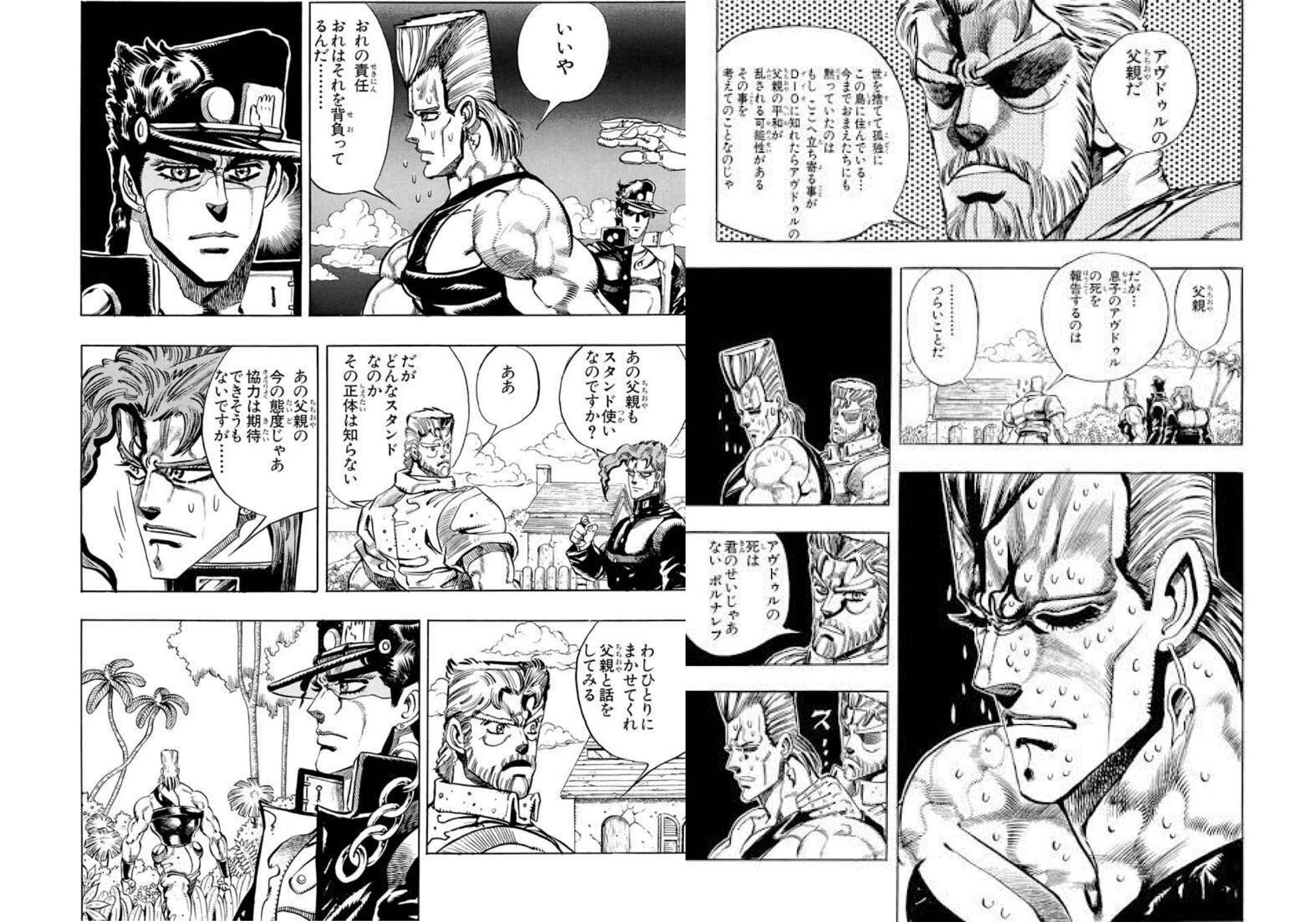 | … | 3625/08/26(火)15:14:50No.1347083500+汗だらっだらのポルナレフを見て(おっいける!)と確信した表情のジジイのコマ |