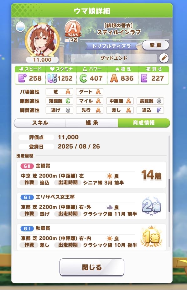 | … | 77925/08/26(火)19:44:09No.1347152005そうだねx4スティルインラブの脚質が後方寄りのものだったから成立するキャラだよなぁって思う |