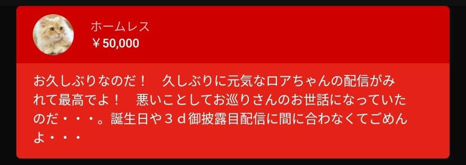 | … | 5225/08/26(火)21:11:56No.1347185539+スパチャすること自体にはケチ付けないけどもう少し楽しい文章送ってあげたほうがいいんじゃないかな… |
