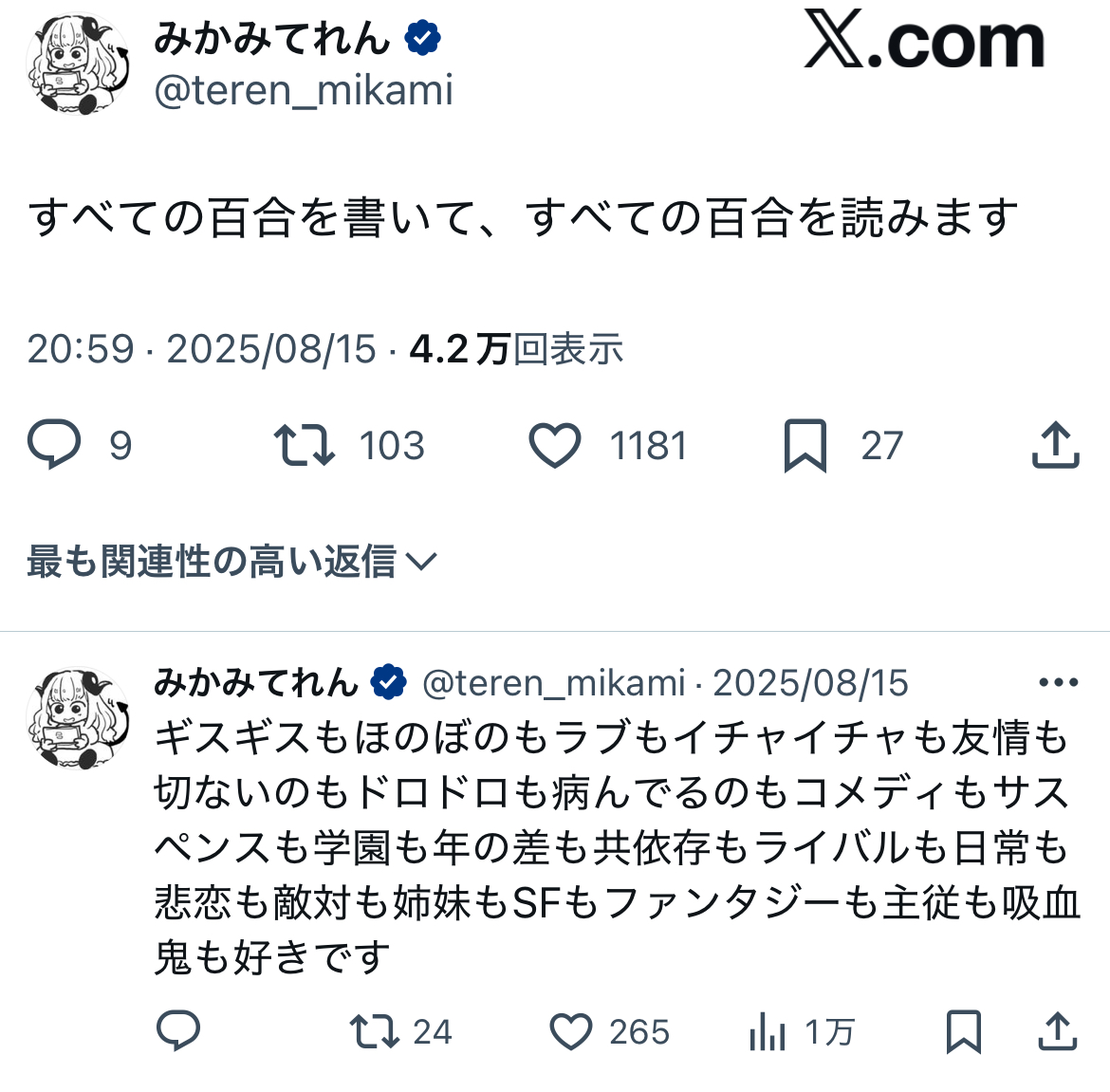 | … | 20025/08/27(水)20:21:18No.1347461908+>>世界に百合作品が増えるとてれんせんせが喜ぶ |