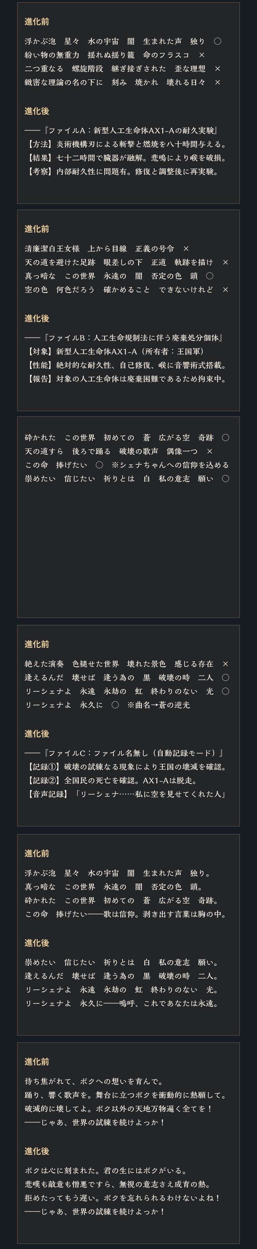 | … | 90525/08/27(水)20:06:36 ID:3sAo4qpsNo.1347455642+ネメシスの◯✖️これアクシアちゃんの歌詞制作の仮定ルナ…? |