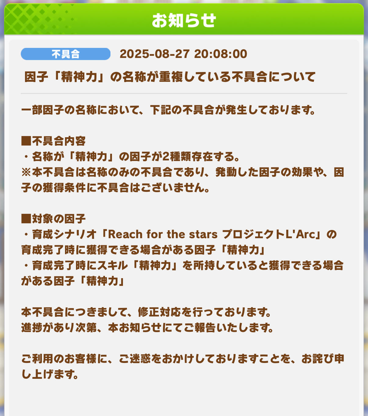 ※本不具合は名称のみの不具合であり、発動した因子の効果や、因子の獲得条件に不具合はございません。