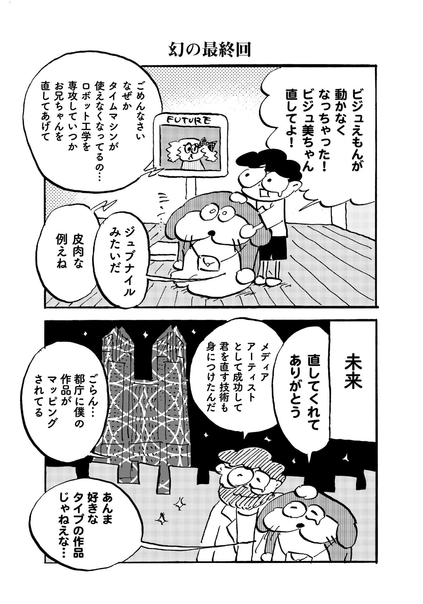 | … | 9325/08/27(水)21:36:54No.1347492518+>>ビジュえもんぐらい全部のコマでボケてて全部のコマでツッコんでて全部のコマでオチてる漫画読みたい |