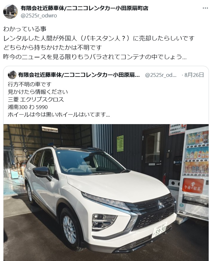 | … | 5925/08/28(木)15:05:48No.1347675655+>買い取った外国人は善意の第三者になるから車は返ってこないやつだ! |