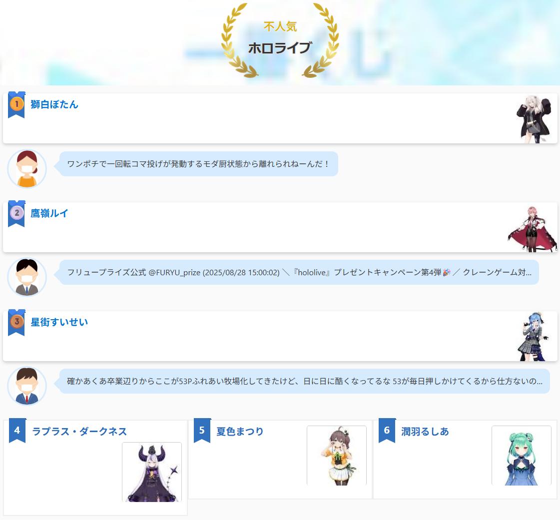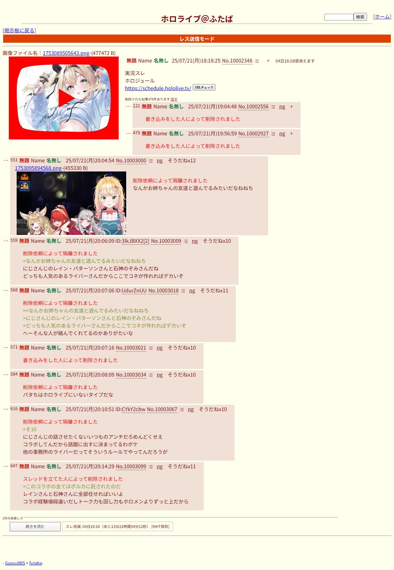 | … | 48525/08/29(金)18:09:34No.1348002972+普段立たないホロライブの実況スレが立ったけど0レスで落ちたやつ |