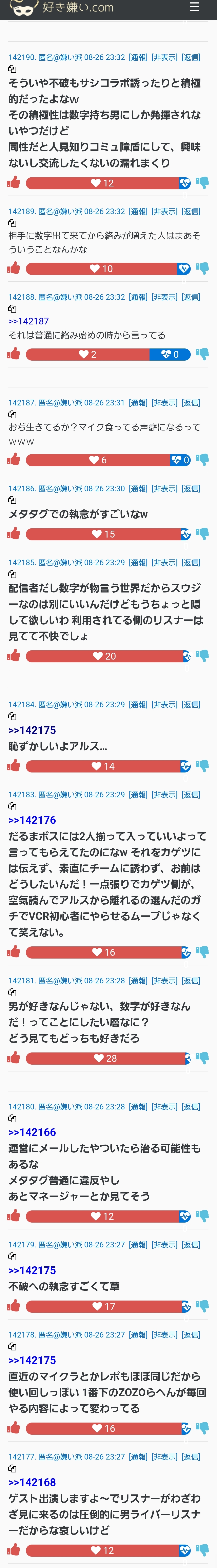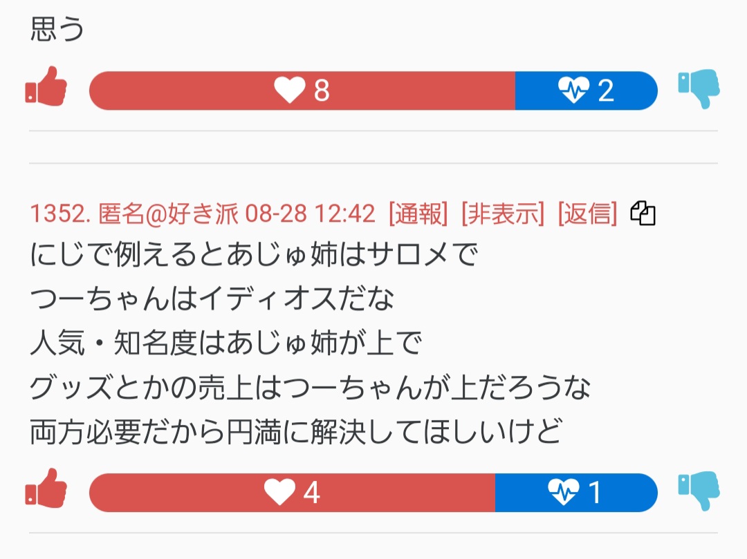 | … | 54225/08/29(金)18:29:29No.1348008208+>>あのスレの住人って元々にじ視聴してたのばっかだろ |