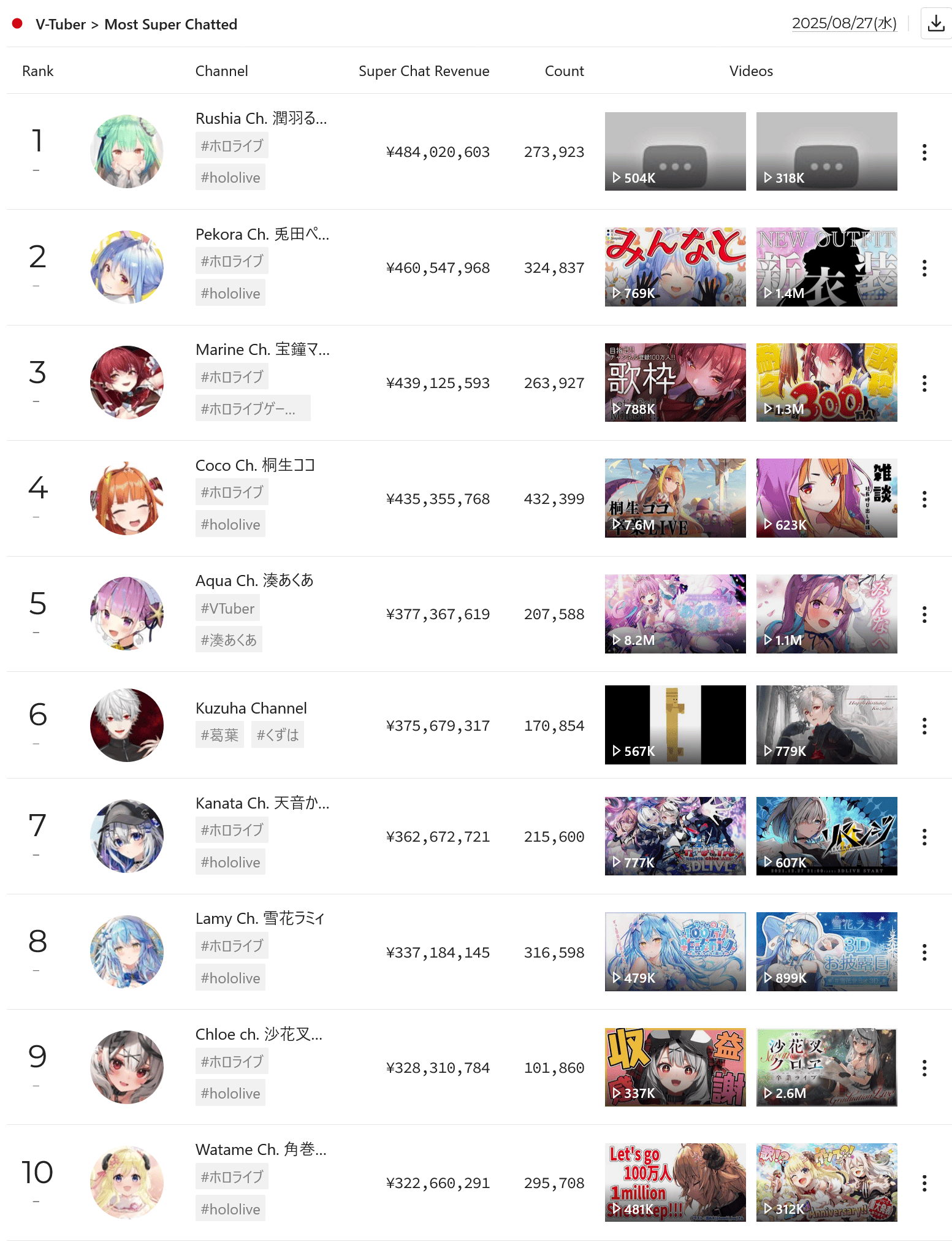 | … | 5925/08/29(金)21:43:09No.1348085285そうだねx5>>あのーなら所属人数倍のにじさんじ女ライバーがホロより多くランクインしてるはずです |