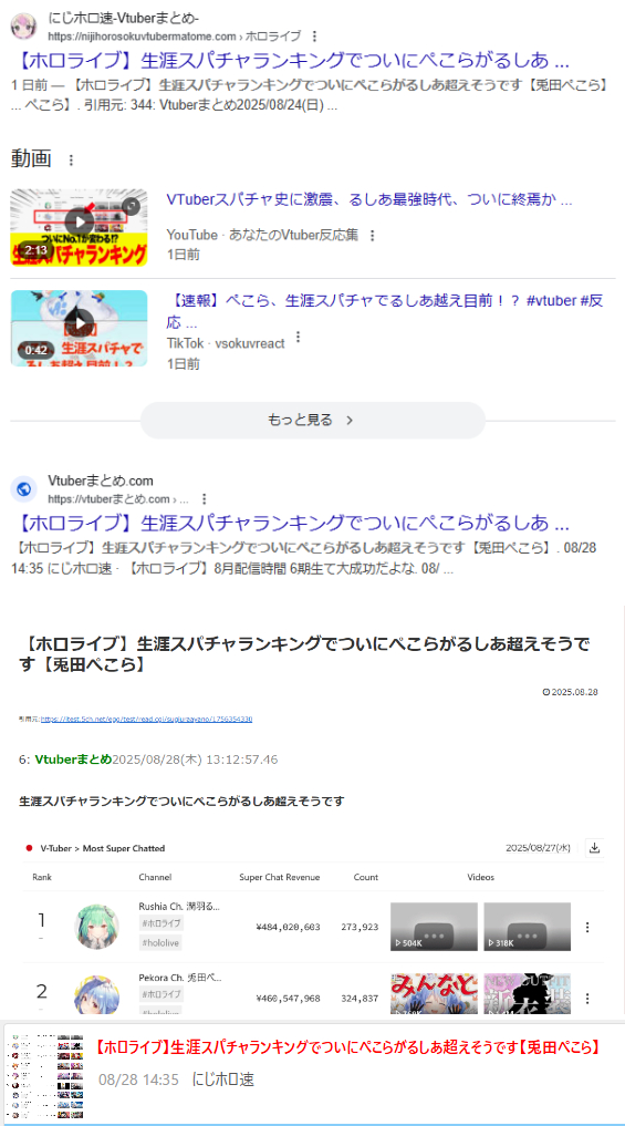| … | 9125/08/29(金)22:00:02No.1348093555そうだねx4案の定にじリスの巣の杉浦綾乃からのまとめの流れだけどクソまとめって杉浦の元のレスから1時間程度で記事作るしにじリスがよくコメントしてるまとめ動画も数時間以内に動画化してて連携早いっすね |