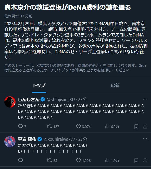 | … | 4125/08/29(金)22:49:34No.1348117854そうだねx25今日のMVPは高木と言いたいとこだがやっぱうりょさんかな… |