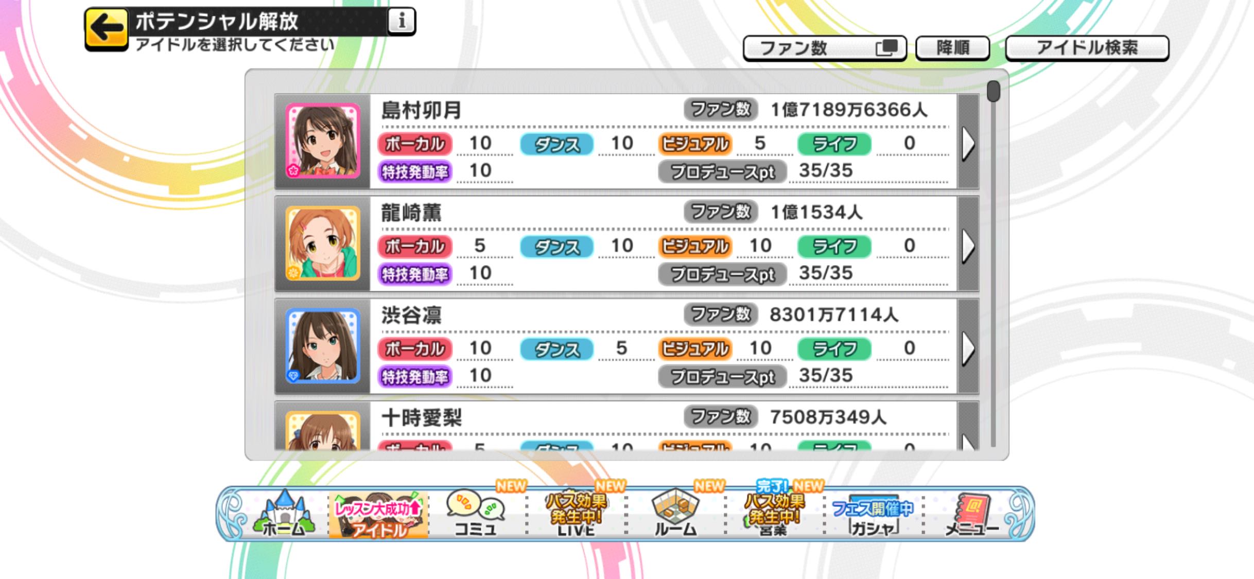 | … | 9825/09/01(月)00:32:00No.1348851073+新規アイドル追加やイベントの更新は停止するけど9月下旬に塔常設化を筆頭に色々アップデート入る予定で 10月からはアイドル別ファン数ランキング開幕するからむしろ今後もたくさん遊べますよ |