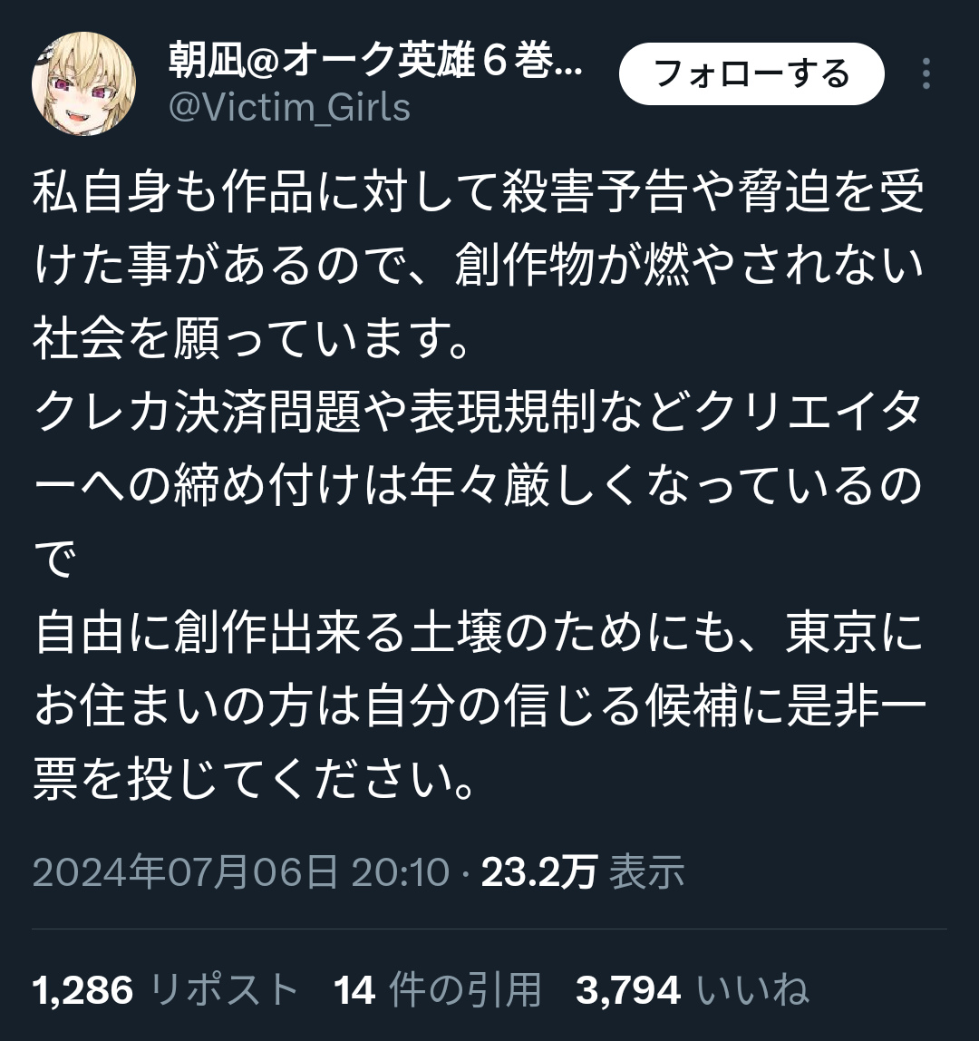 | … | 16825/09/01(月)05:30:43No.1348886528+政治発言はそこそこキツいけど「絵師が政治発言しちゃダメなんですか!?」ってキレてるのは単にSNS向いてねぇなと思う |