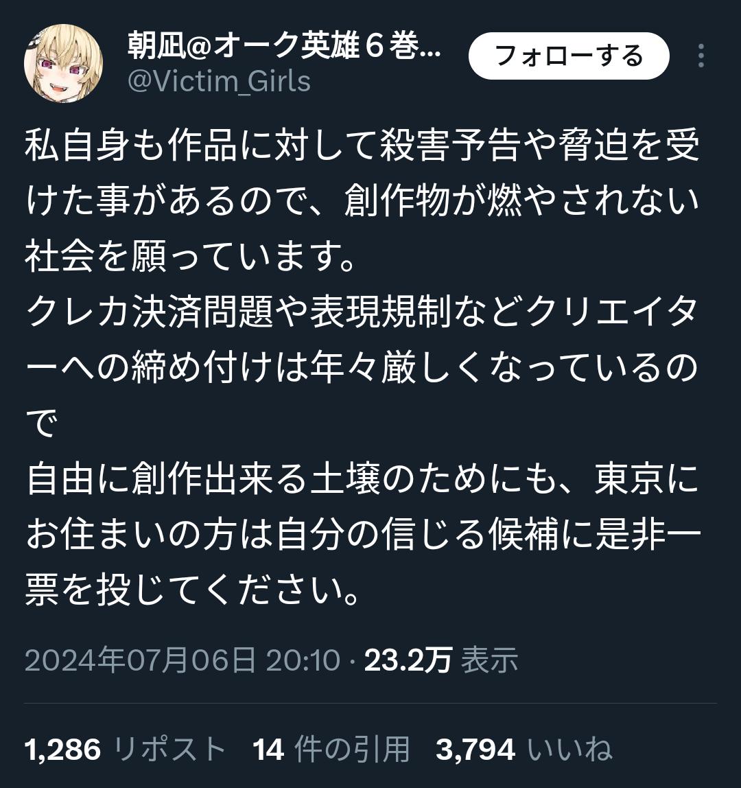 | … | 18425/09/01(月)18:38:33No.1349026241そうだねx1社民党共産党支持してる系のツイフェミが |
