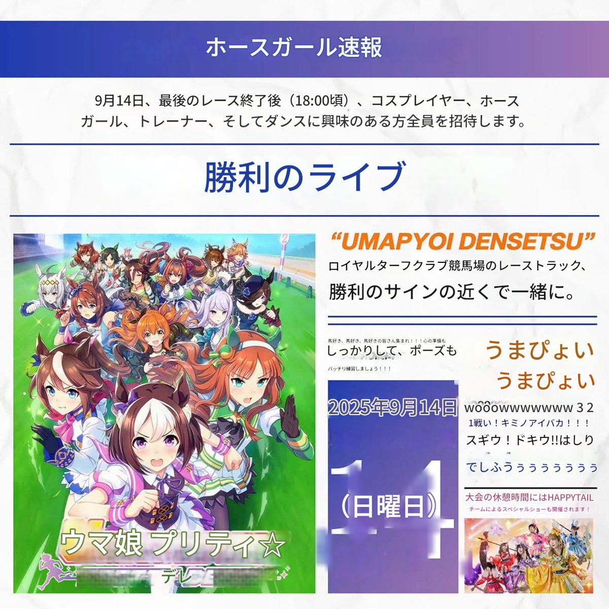 | … | 625/09/01(月)23:28:07No.1349154542+>9月14日、最後のレース終了後(18:00頃)、コスプレイヤー、ホースガール、トレーナー、そしてダンスに興味のある方全員を招待します。 |