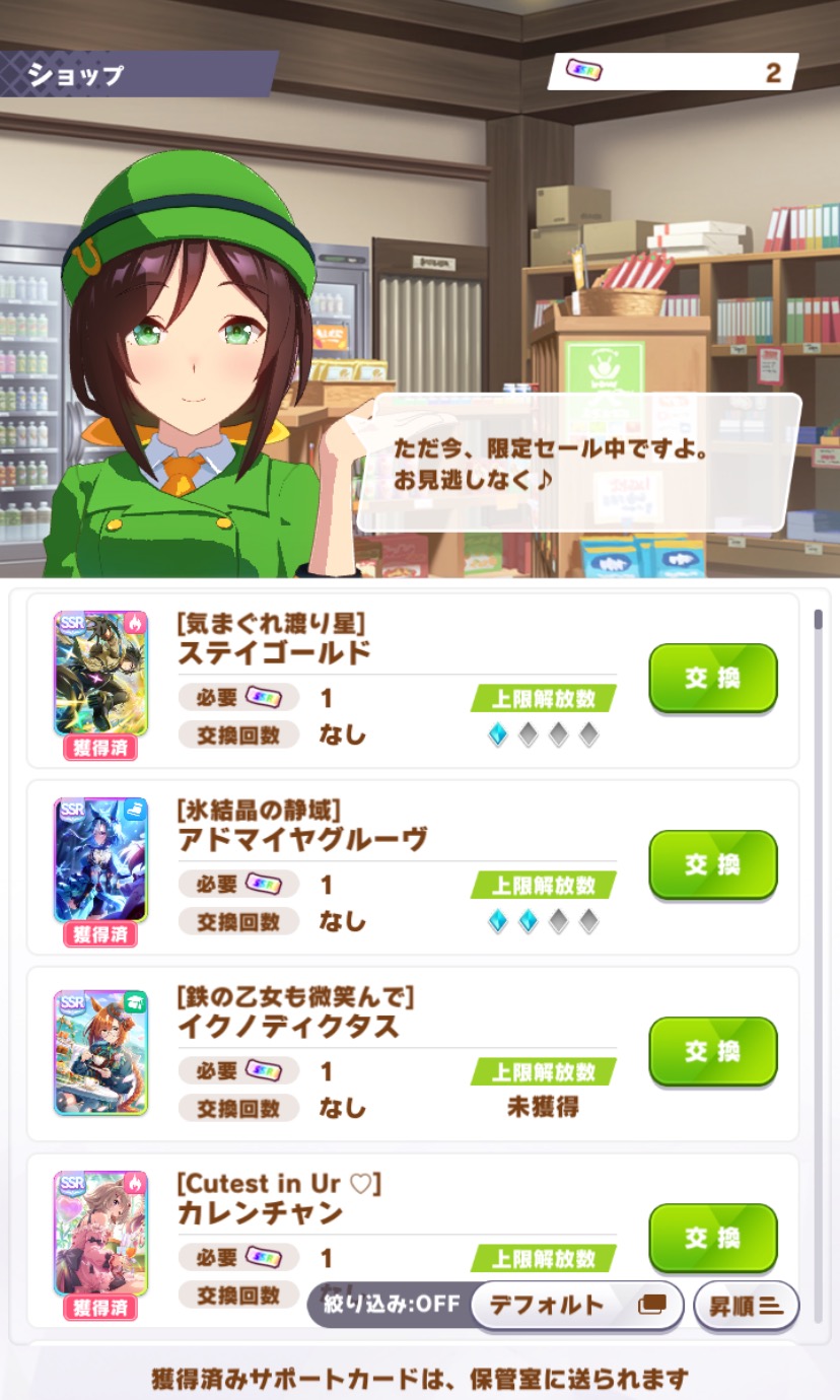 | … | 57825/09/02(火)06:11:24No.1349211079+虹結晶は最新のサポカに使えるのが一番いいとこなので 新シナリオ合わせのサポカまで取っておきたいですね |