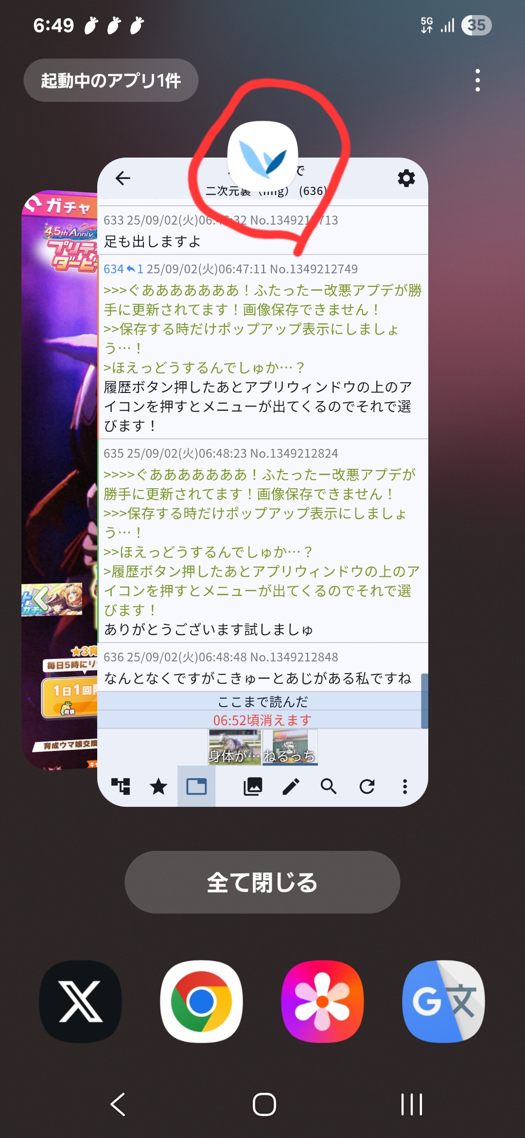 | … | 63525/09/02(火)06:48:23No.1349212824+>>>>ぐあああああああ!ふたったー改悪アプデが勝手に更新されてます!画像保存できません! >>>保存する時だけポップアップ表示にしましょう…! >>ほえっどうするんでしゅか…? >履歴ボタン押したあとアプリウィンドウの上のアイコンを押すとメニューが出てくるのでそれで選びます! ありがとうございます試しましゅ |