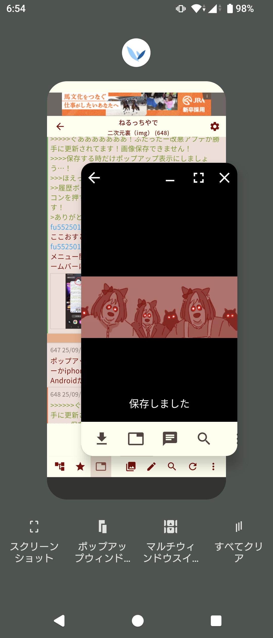 | … | 65925/09/02(火)06:57:38No.1349213432+>何故保存できなくてなぜポップアップで解決できるのかをアプデサボってたわたちにおしえてくだち アプデするとスレのあぷ画像開くと下部メニューバーとスマホ自体のホームバーが重なって操作不能になっちゃうんです fu5525023.jpg |