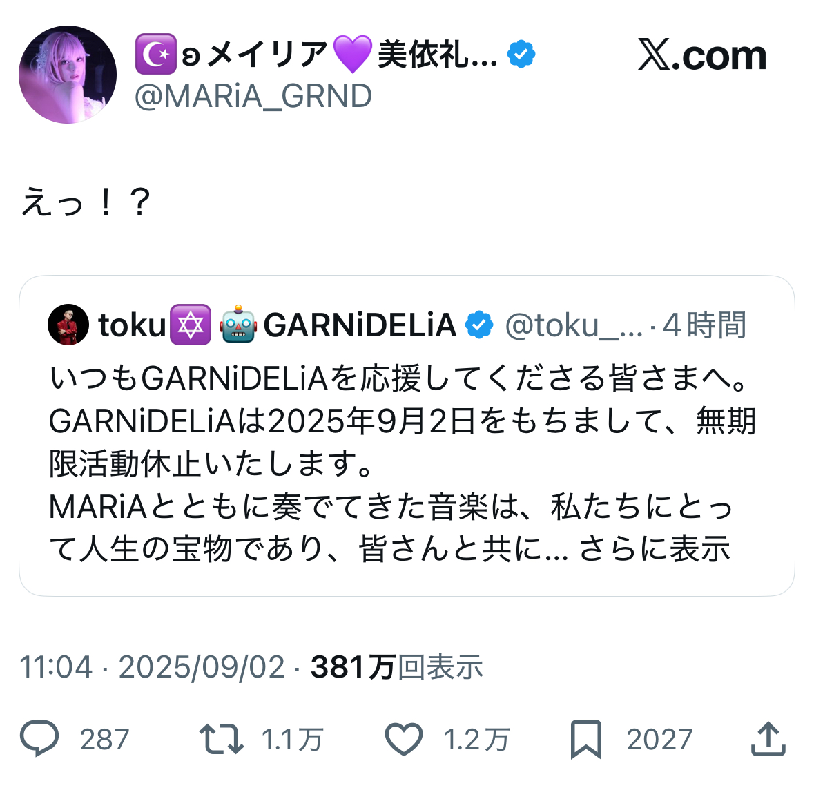 | … | 25525/09/02(火)16:26:01No.1349315798そうだねx2>https://x.com/MARiA_GRND/status/1962777944864235998 |