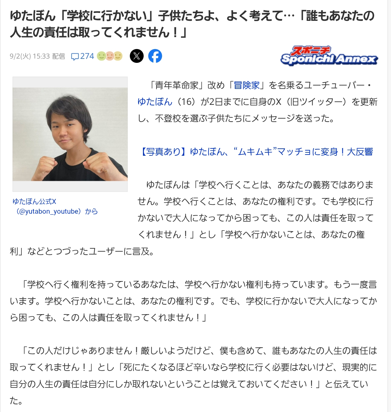 | … | 13325/09/02(火)18:07:48No.1349339940+16歳の子供なのに凄い立派な事言ってるな |
