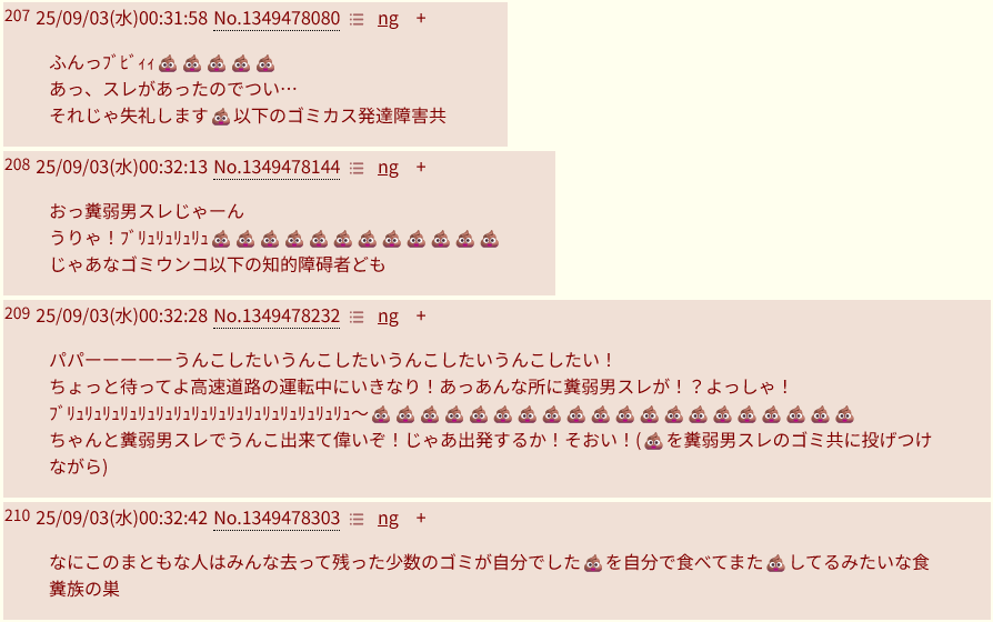 | … | 5725/09/03(水)01:32:36No.1349493042+うんこは本能的な忌避感を覚えさせるものなのでうんこを罵倒に使えるということはギリギリ社会復帰の目があると思う |