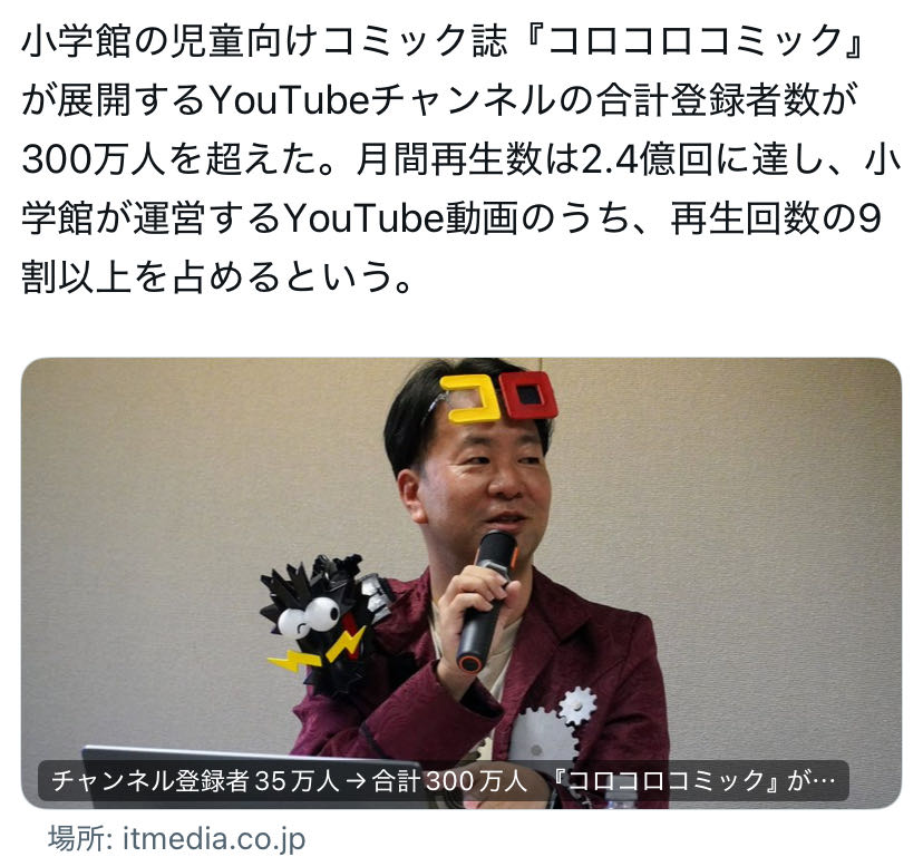 | … | 9425/09/03(水)20:40:27No.1349687166+>コロコロチャンネルだけだと71万で再生数もまばらだった |