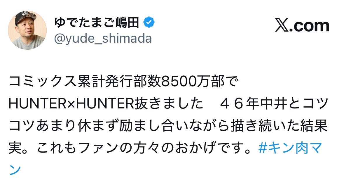 | … | 5025/09/04(木)16:55:23No.1349906251そうだねx4全盛期のキン肉マンよりハンターハンターのほうが売れてたんだねえ |