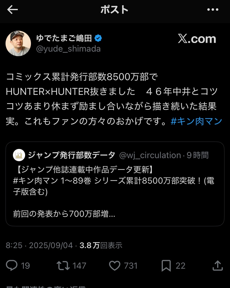| … | 5225/09/04(木)19:41:42No.1349950508+基本的にいちいち発行部数を調査して発表してないだけでハンターも普通に8500万部以上あると思う |