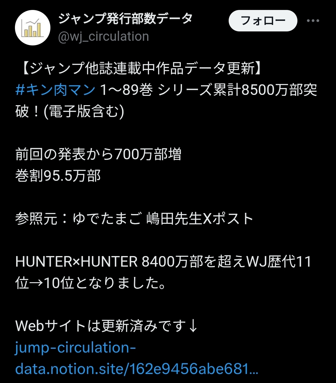 | … | 5425/09/04(木)19:42:04No.1349950648+>基本的にいちいち発行部数を調査して発表してないだけでハンターも普通に8500万部以上あると思う |