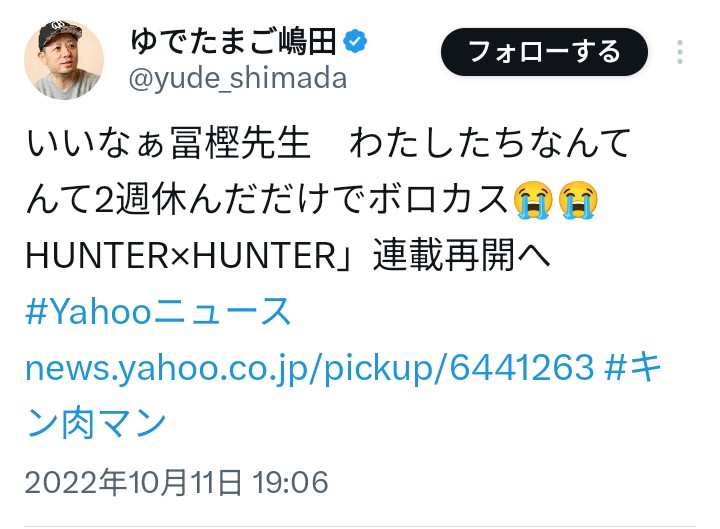 | … | 7525/09/04(木)20:00:11No.1349956524そうだねx1>また冨樫連載再開しそうだけど大丈夫だろうか… |