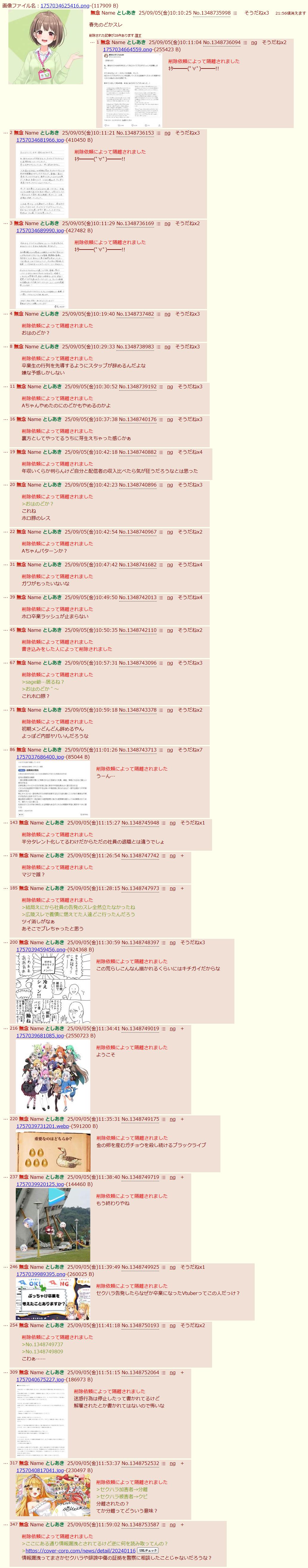 | … | 5625/09/05(金)14:46:31No.1350171533そうだねx3>のどか円満退職なのになんで大騒ぎしてんだにじリス |