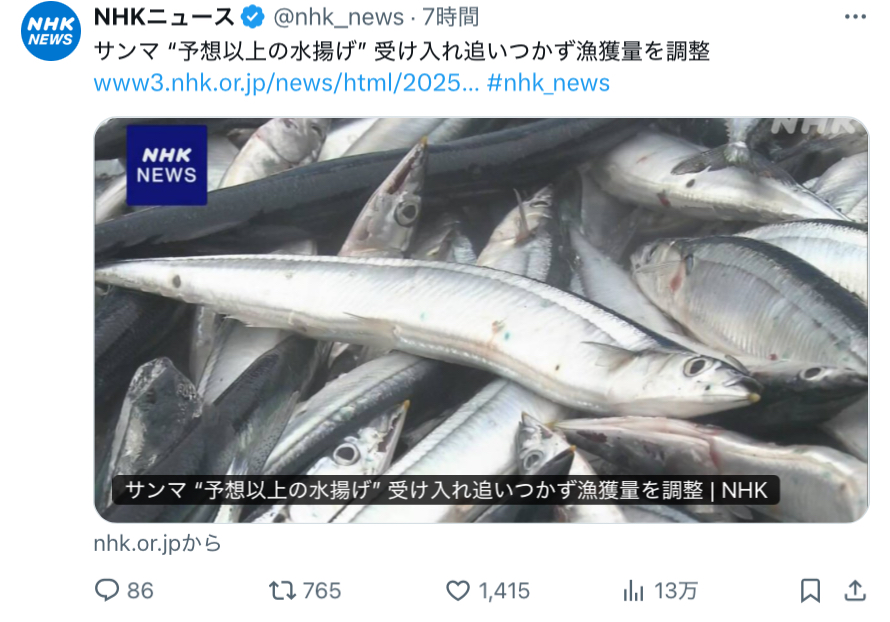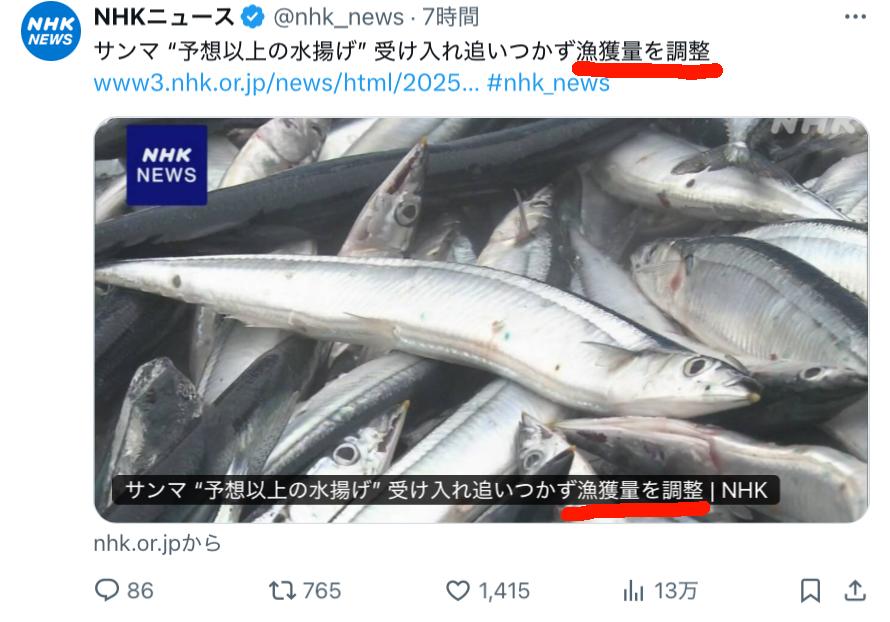 | … | 6425/09/06(土)02:42:43No.1350382779そうだねx1黒潮大蛇行の影響かなにかでサンマの漁場がずっと沖合になって日本の小型漁船が獲りに行けなかっただけ |