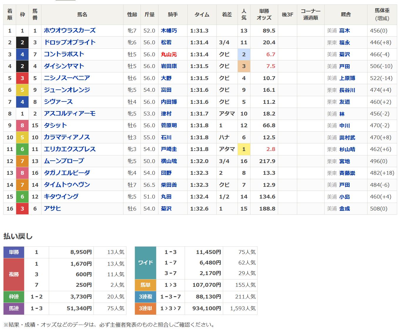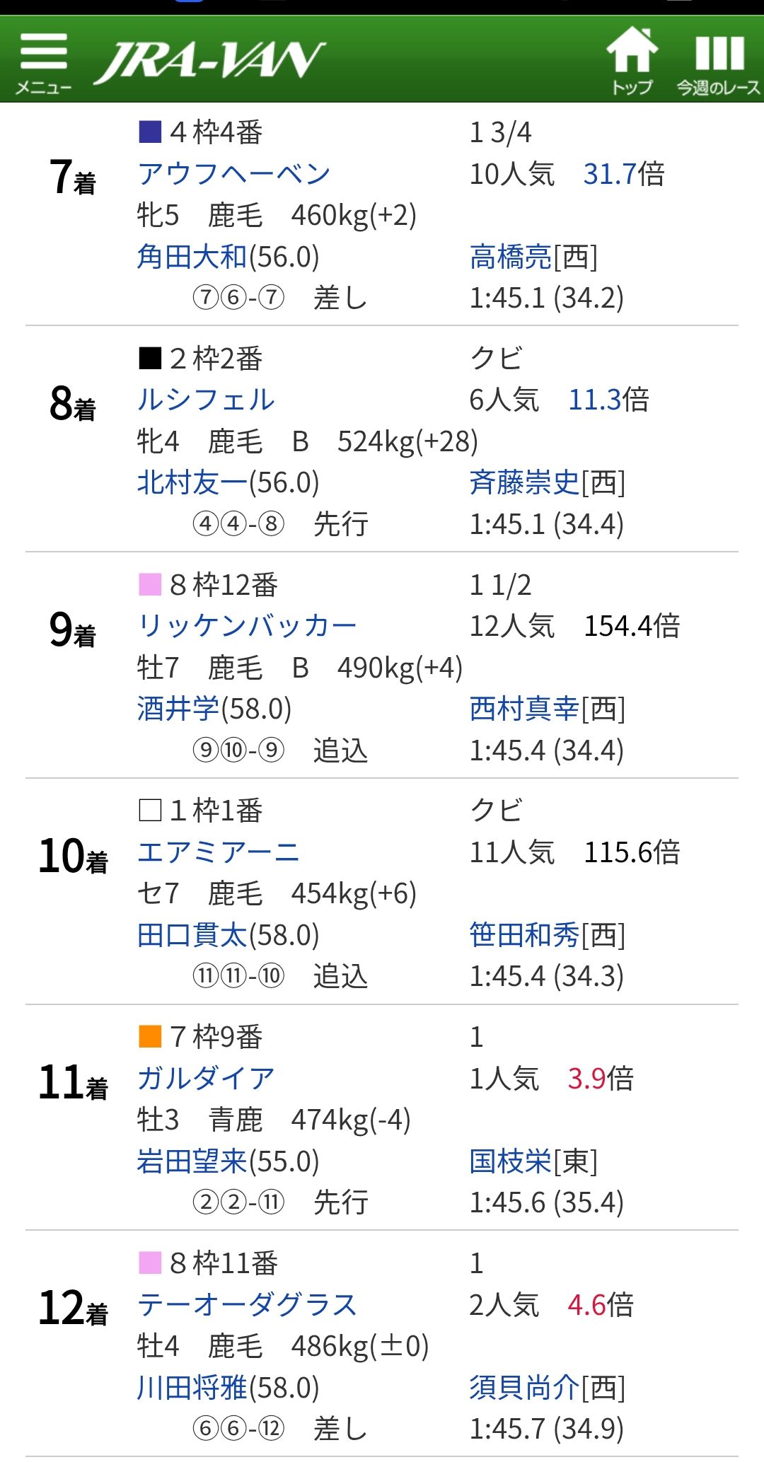 | … | 9025/09/06(土)16:05:48 ID:quJztrs2No.1350522334そうだねx2上がりタイム出ましたが速い上がりが使えないエリカ様には厳しいレースでしたね |