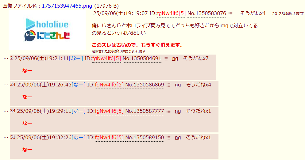 | … | 1025/09/06(土)21:34:02No.1350641759そうだねx12>俺ホロライブもにじさんじも好きなんだけど |