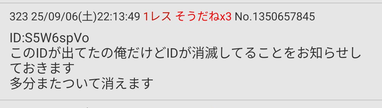 | … | 54225/09/06(土)22:42:00No.1350668822そうだねx1>上で出されてるID消えてますね |