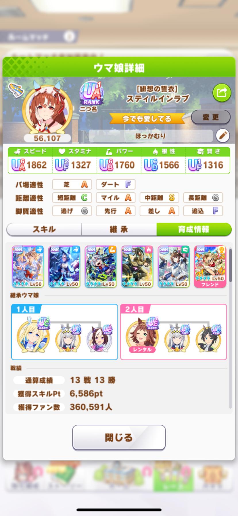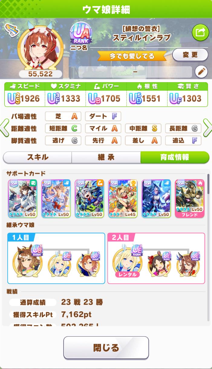 | … | 1425/09/07(日)10:24:23No.1350792527+>こっからタマとアルヴの金スキルしか完走しなかったのがうちのスティルだ |