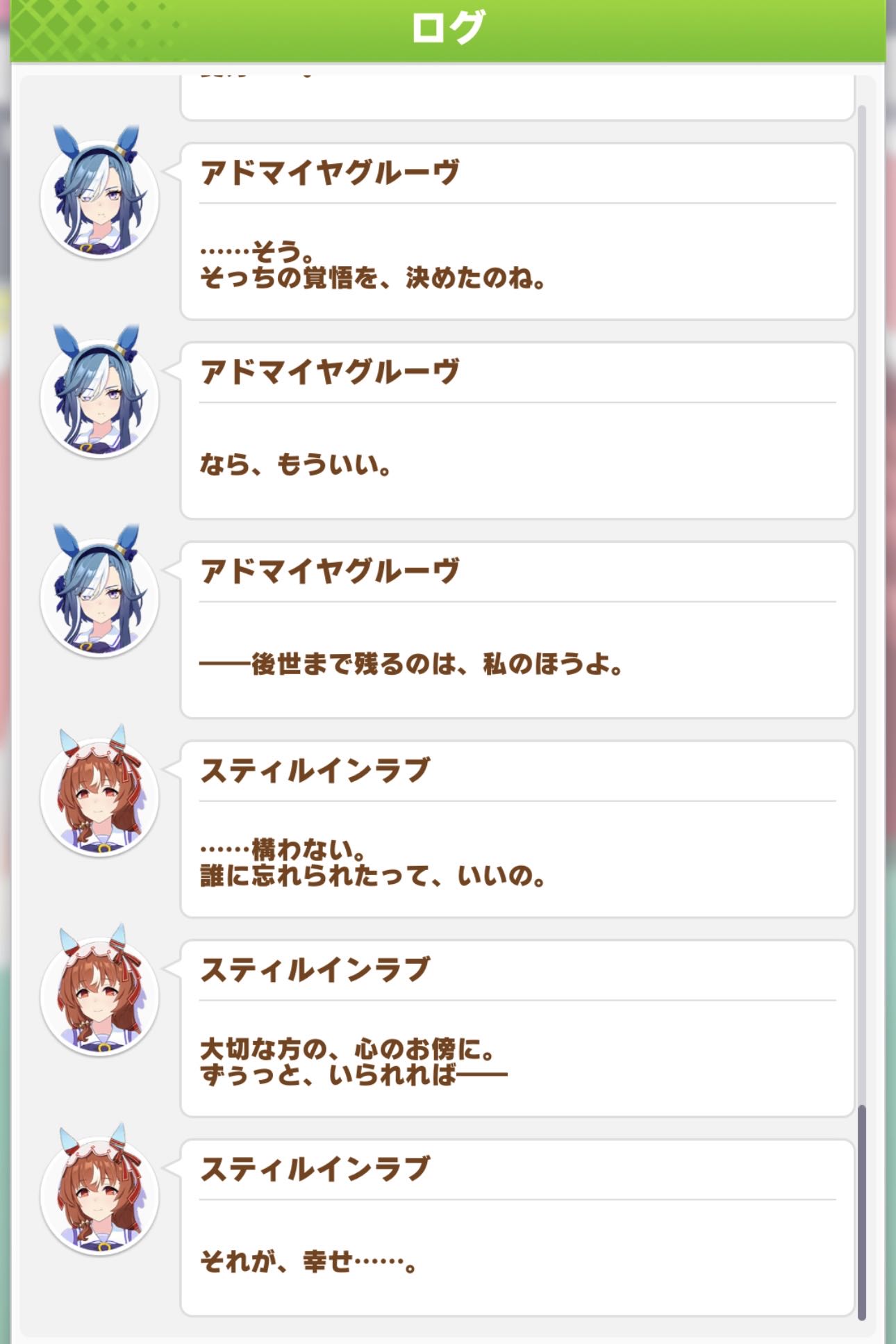 | … | 13025/09/07(日)20:25:36No.1350992418+>別の子の育成で出てきたスティルにプレイヤーの知らない愛しのあの方がいて良い感じのところへ落ち着いたエンドを迎えたらそれこそ育成なんだったんだよってなっちゃうからあまりやってほしくはない |