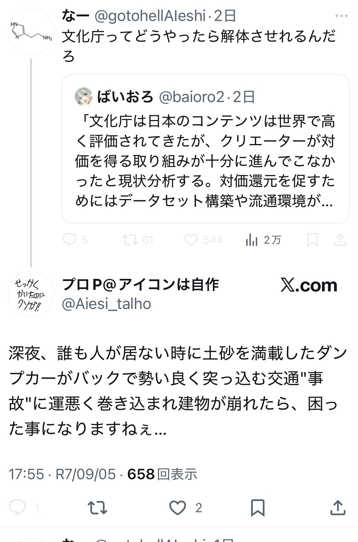 | … | 725/09/07(日)22:21:04No.1351043306そうだねx2ギャグで言ってるにしてもつまんなすぎて「ほかの建物に文化庁の機能を移譲するだけだろ……」マジレスされるタイプのスベりかた |