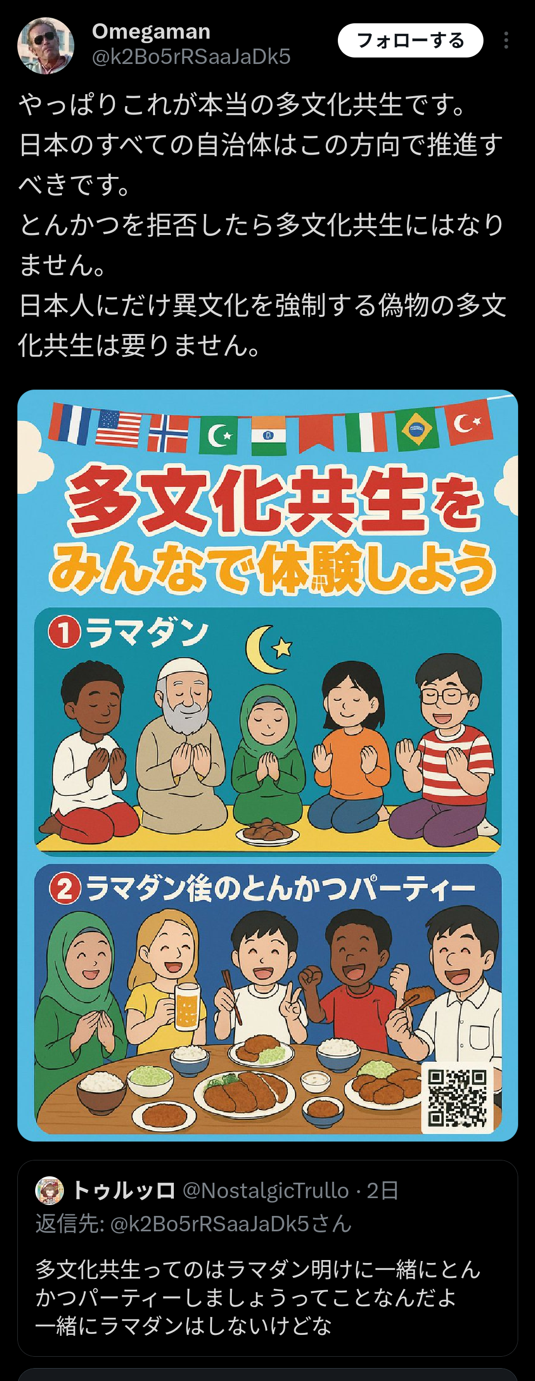 | … | 6825/09/08(月)08:44:03No.1351137442+>向こうが日本人もラマダンしろ!っていうならスレ画も正論だけど主張してるのは「俺らにラマダンやらせてくれ」だからなんも正しくないんだよな |
