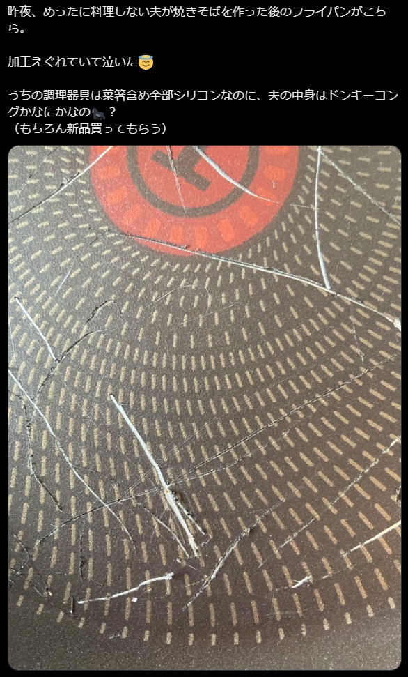 | … | 825/09/08(月)12:15:45No.1351171108そうだねx147>「話を聞いてみると(普段料理しないので知識が無いため)フライパンに油を引かず、最初から強火で炒めたようで、一部が焦げ付き、それを落とそうとしてシリコン菜箸でガリガリやったそうです。その結果、シリコン菜箸の金属芯が露出してフライパンの表面を削ってしまったようです」 |