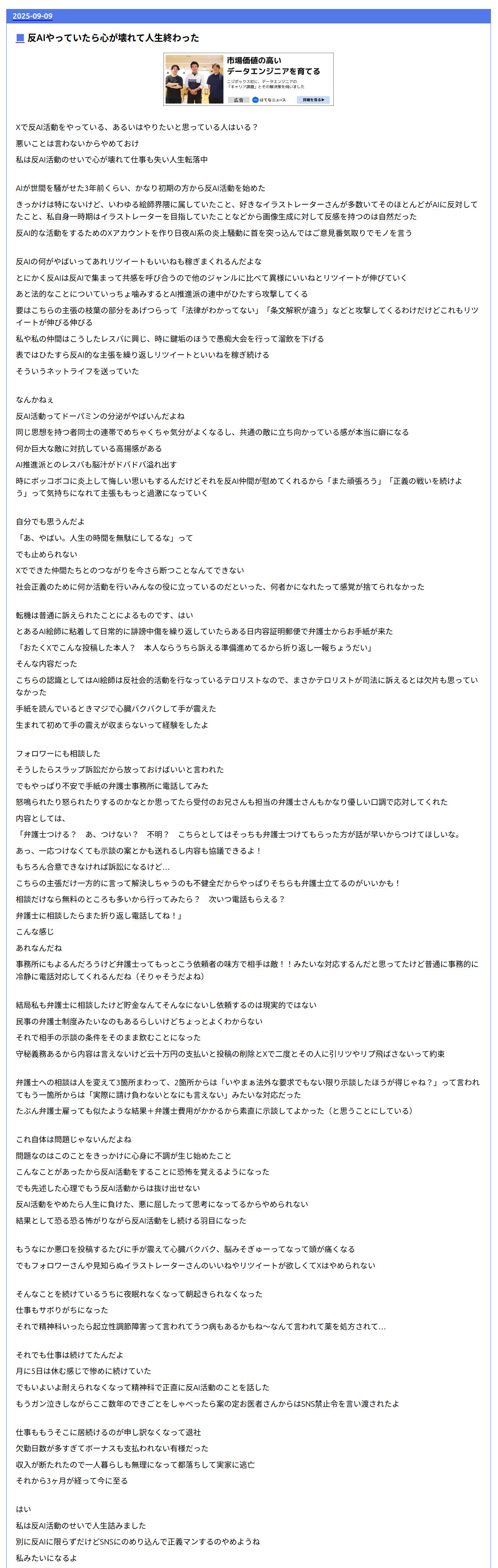 | … | 825/09/10(水)00:22:21No.1351698272そうだねx4これ問題なのは反AI活動じゃなくて誹謗中傷の方なのでは |
