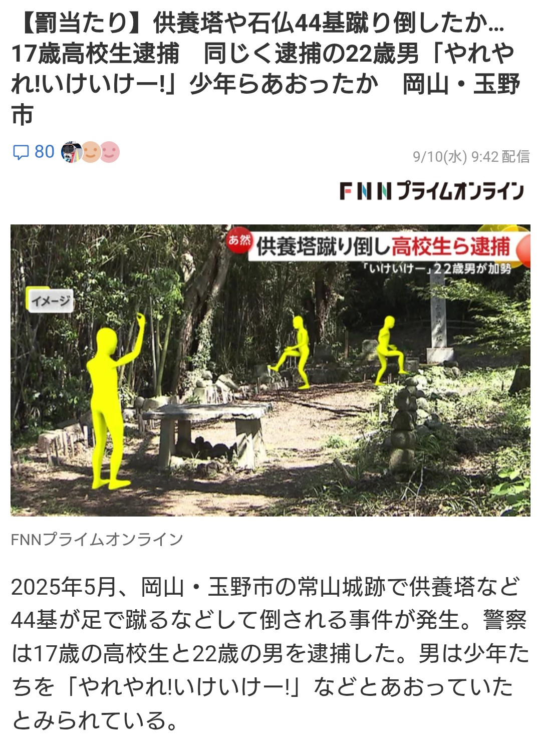 | … | 725/09/10(水)10:30:56No.1351763569そうだねx44>こいつらに倒した供養塔や仏さん直させろよもう |