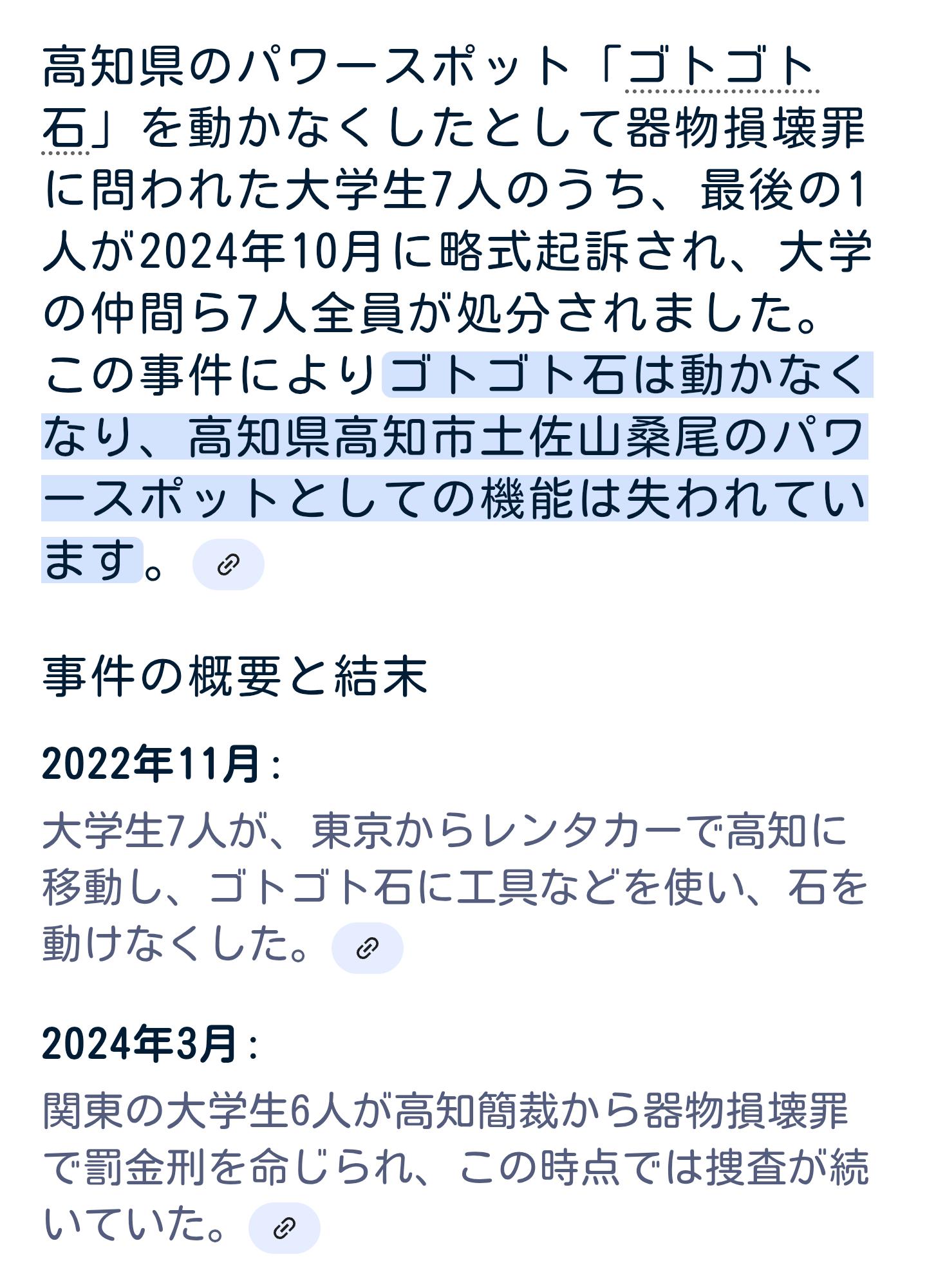 | … | 5725/09/10(水)11:07:58No.1351769488そうだねx1>東京からわざわざ四国まで足を運んで絶対に落ちない石を工具で落とそうとした大学生グループを思い出した |