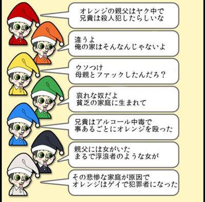 | … | 425/09/11(木)00:27:58No.1352000097そうだねx13>オレンジはこういう一人芝居をブツブツ言いながら人を殺す |