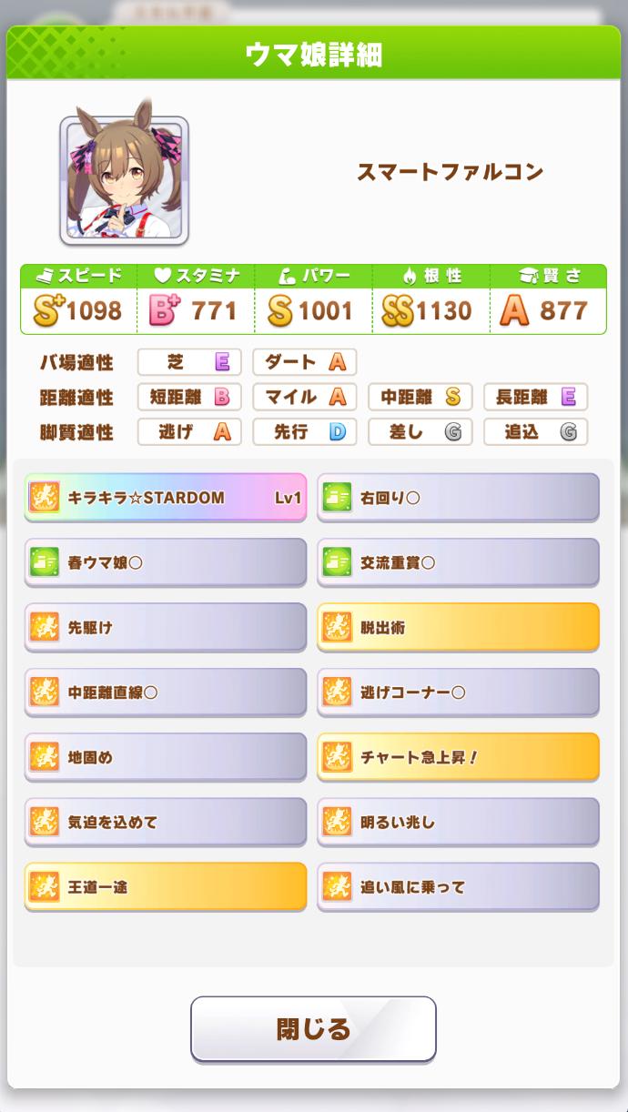 | … | 20325/09/11(木)19:13:33 ID:L58VrM5.No.1352178359+スティルさん今回みたいに特化したレースもありますが中距離レースならどこでも大体3本の指に入るくらい万能みたいですね |