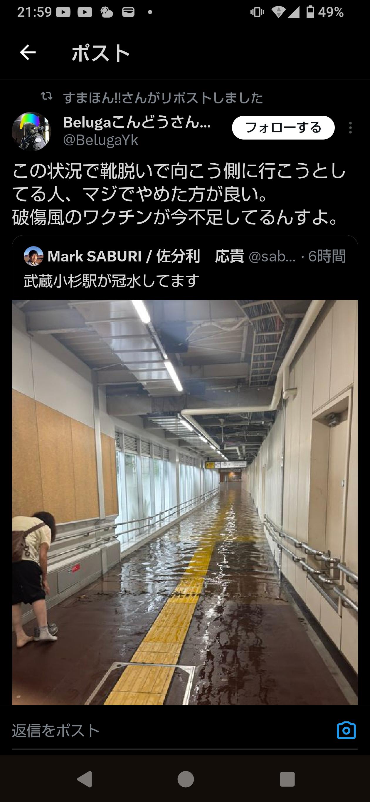 | … | 19425/09/12(金)00:52:20No.1352291371+>こういう時下水に混じって金属片とか釘あってそれで傷ついたらもうね… |