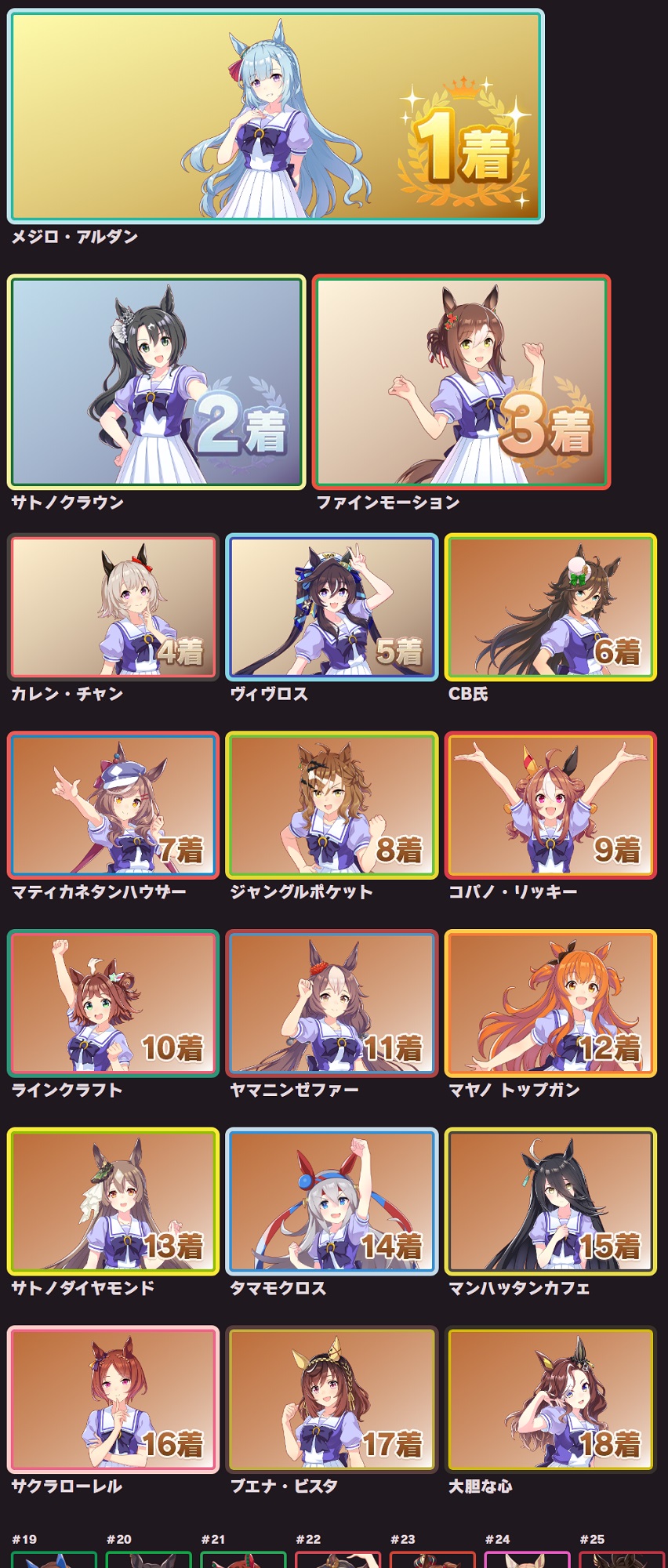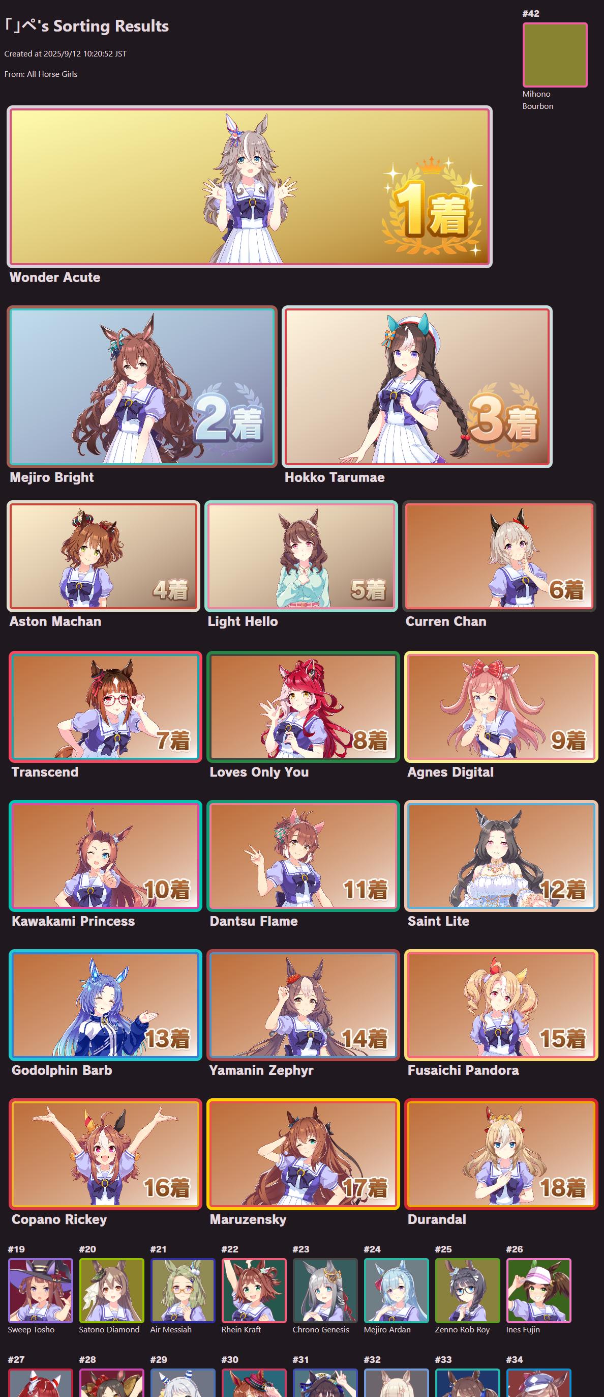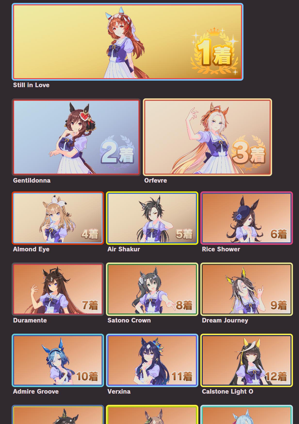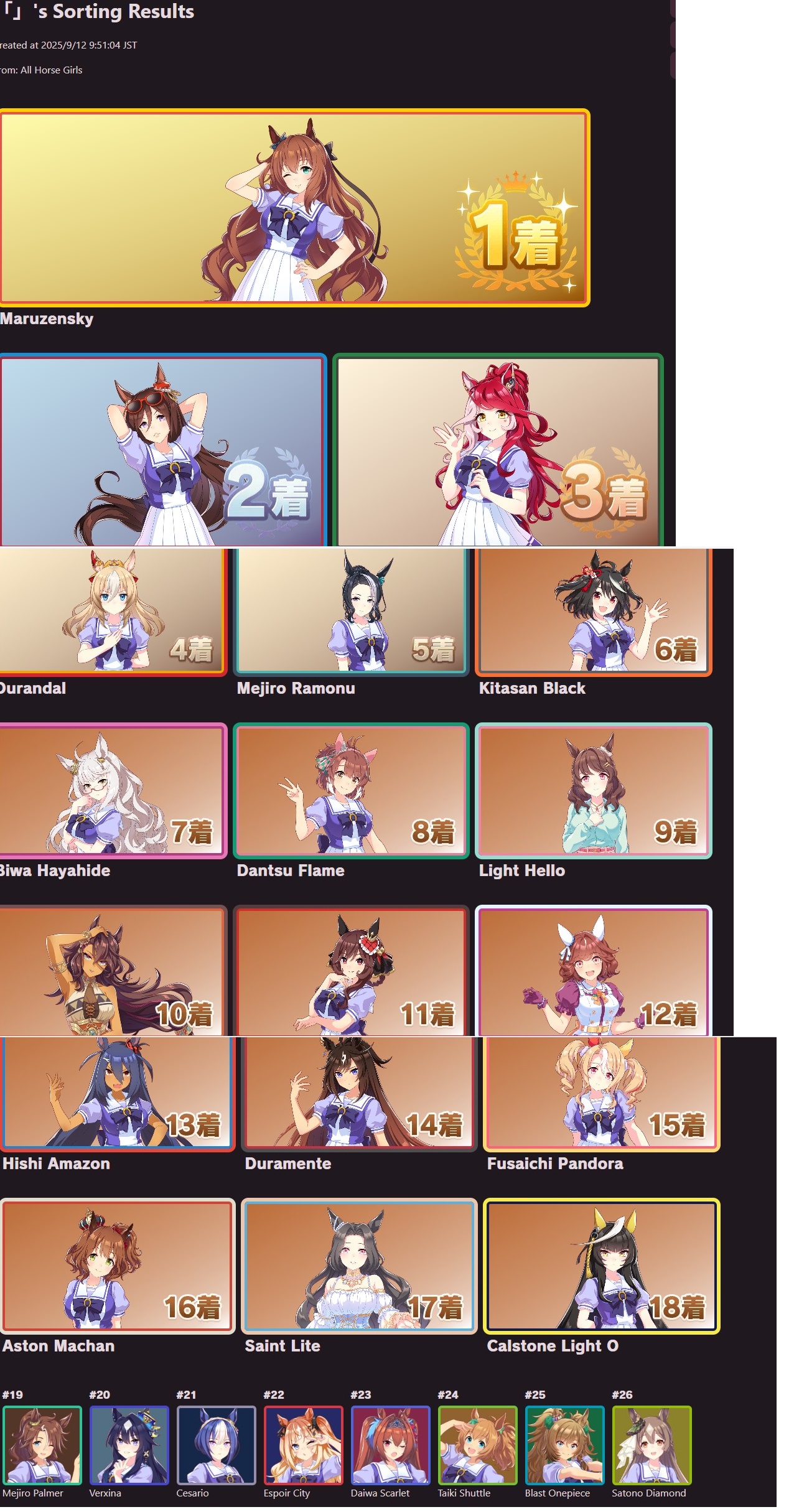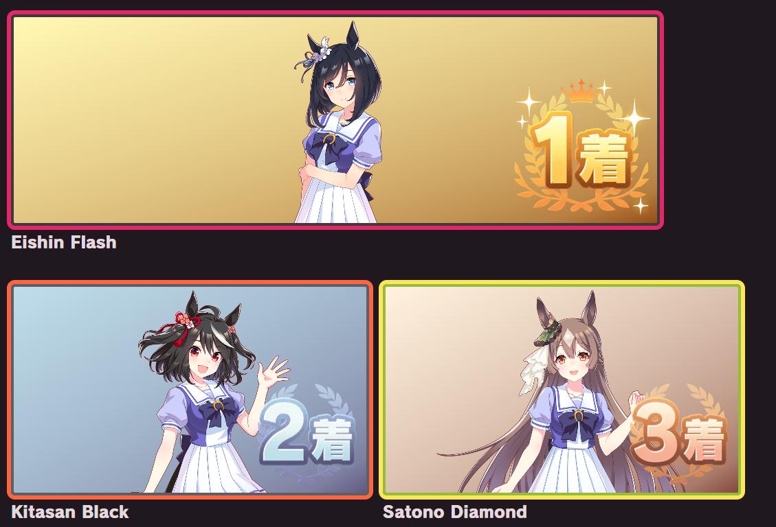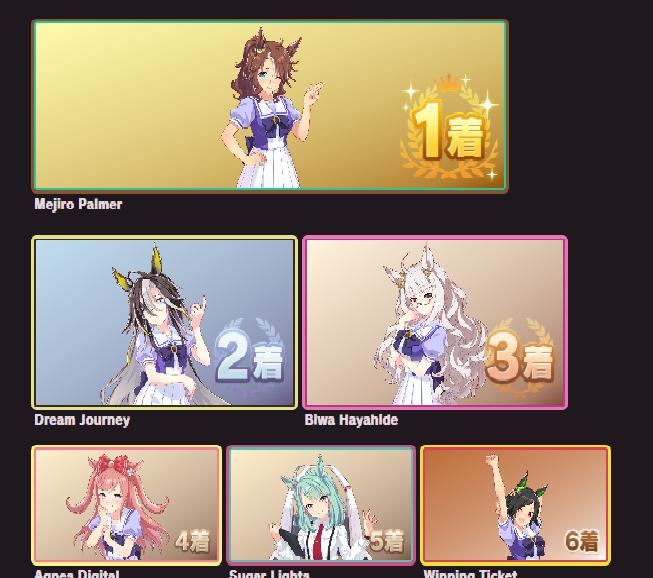 | … | 33625/09/12(金)11:55:47 ID:FA.03sEgNo.1352362545+個人的にオグリさん1位他数人が2位後は全員平等に好き!って感じなのでこの手のやつと相性すこぶる悪いです |